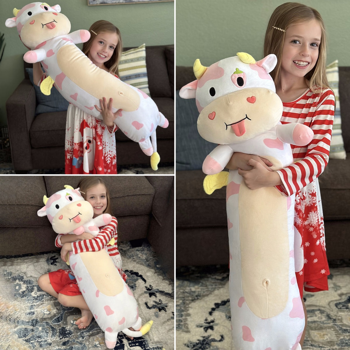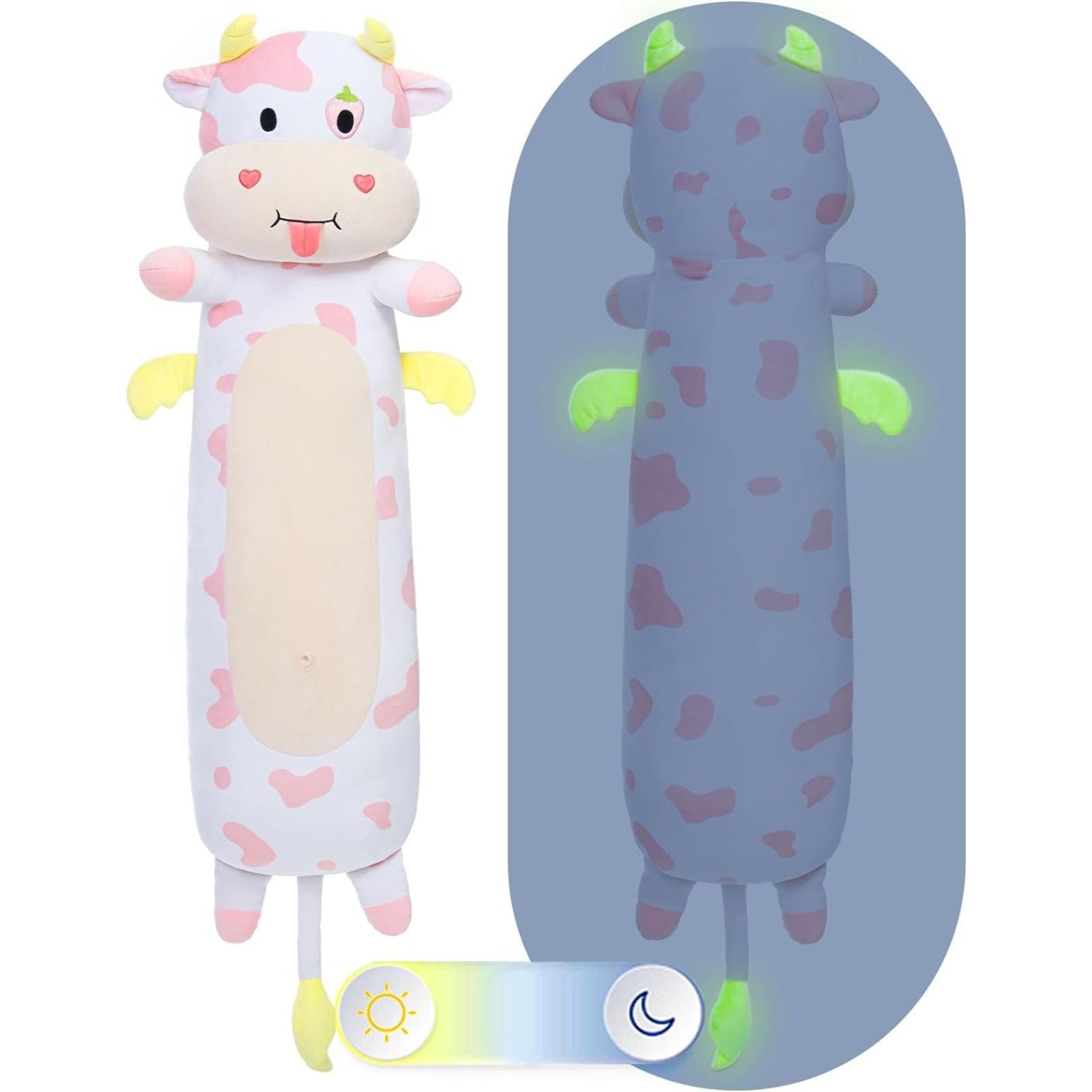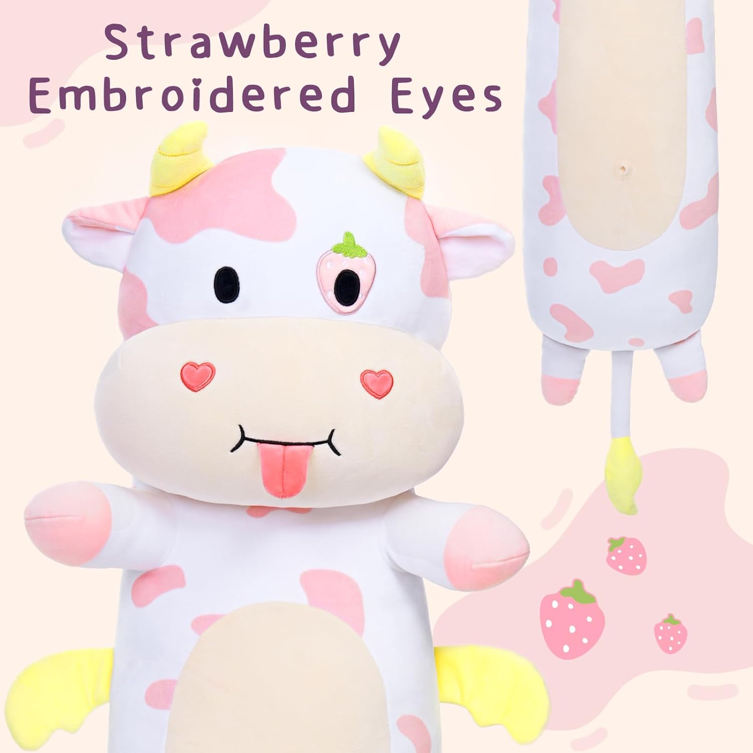 The cow plush toy is absolutely adorable! It has one eye stitched into the shape of a strawberry. and there are cute little hearts on both cheeks. Its white body is covered with pink spots of different sizes. And guess what? It even sticks out its tongue playfully! Here’s a little secret for you: the toy’s horns. wings. and tail can glow in the dark. So much fun!