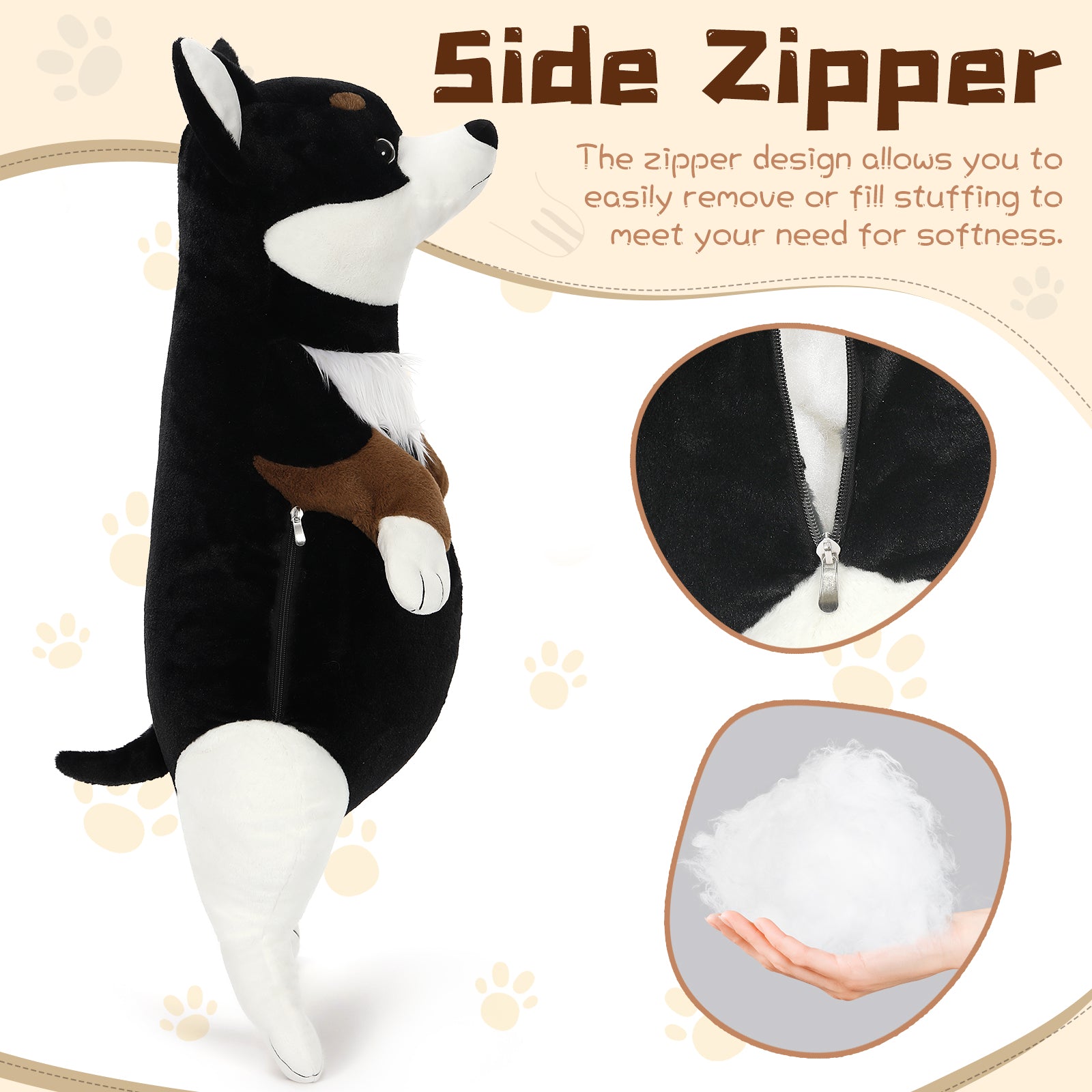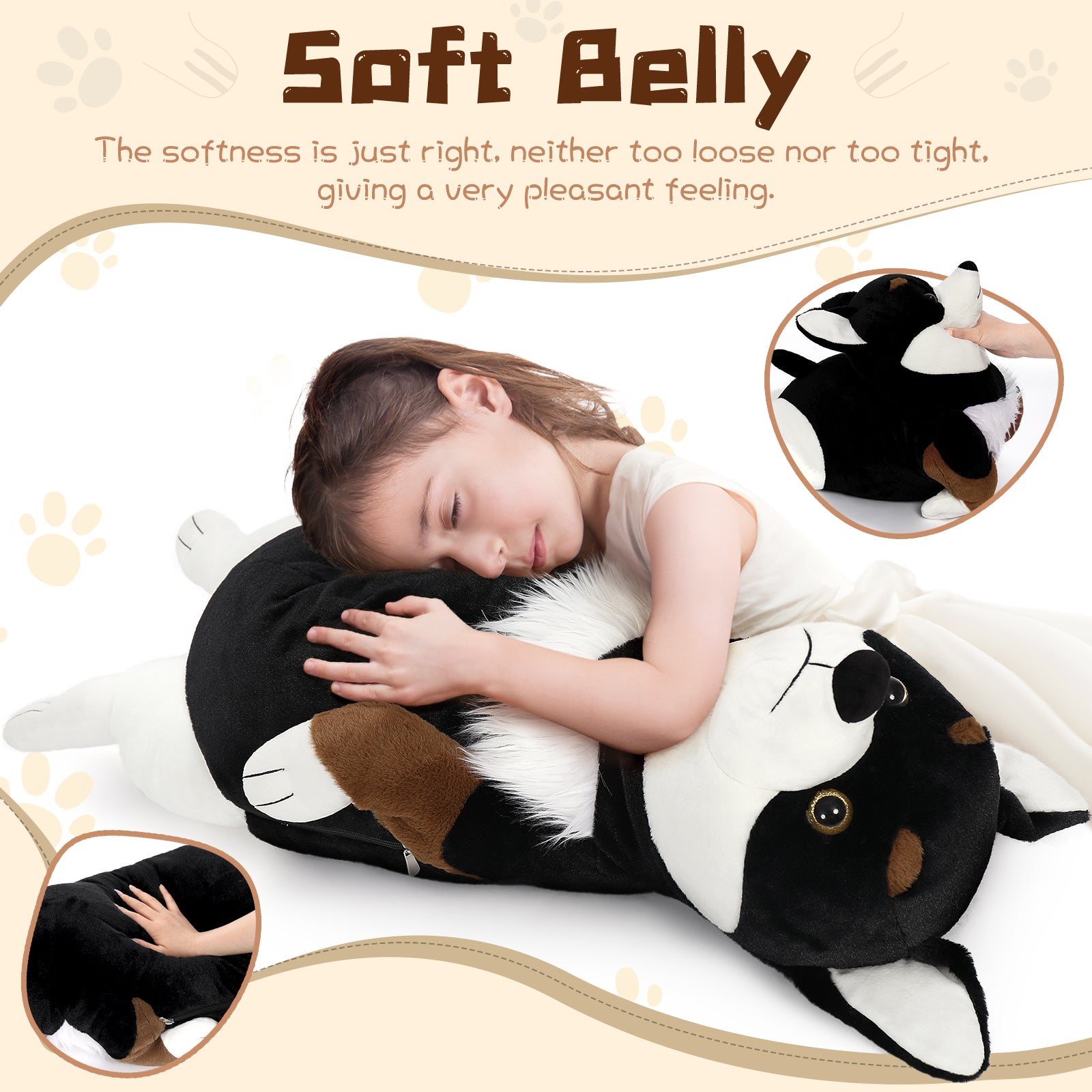 The dog looks relaxed as it lounges on the ground. sporting a round belly and a white fur collar. It’s staring up at the sky with a frown on its face like it’s feeling a bit down. Let’s bring it home and lend a ‘listening’ ear to its worries.
